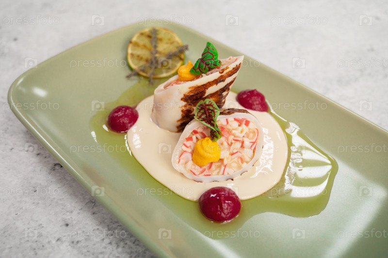 Кальмары, фаршированные крабовым мясом и сыром