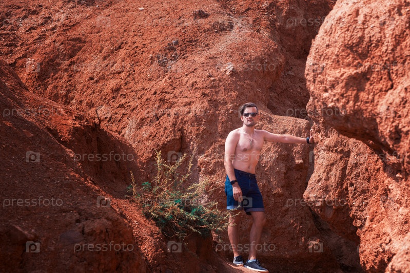 Человек-турист в песчаной карьере в Сибири и Республике Алтай, марсианское поле. Концепция туризма, путешествий и приключений. Кош-агач, Чаган-Узун