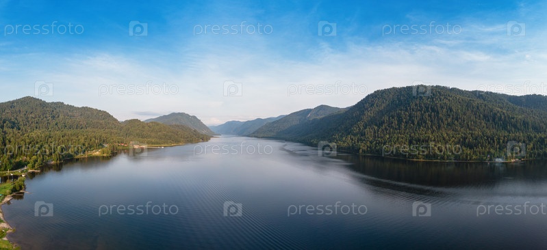 Вид с воздуха на Телецкое озеро в горах Алтая