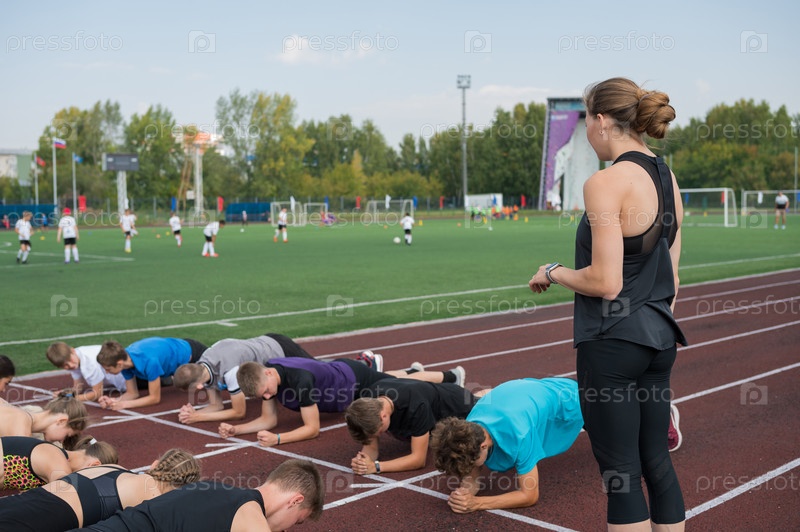 Женский тренер и группа детей проводят тренировку на стадионе. Тренировки в школьном спортзале или легкая атлетика