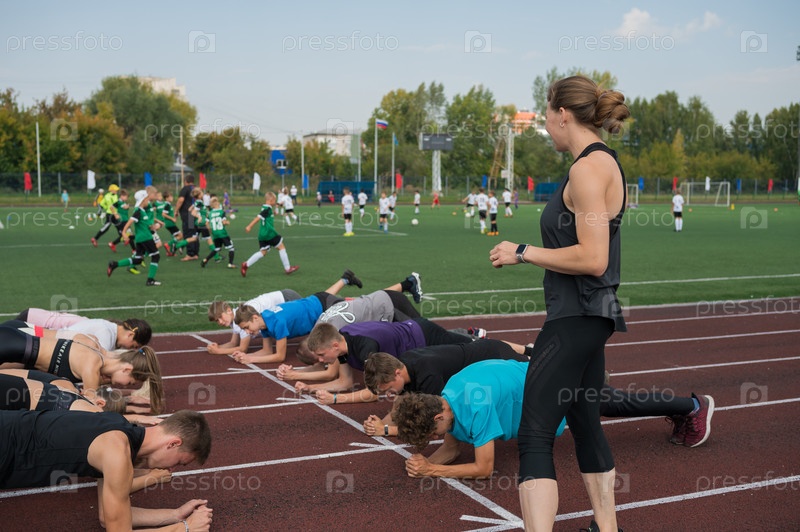 Женский тренер и группа детей проводят тренировку на стадионе. Тренировки в школьном спортзале или легкая атлетика