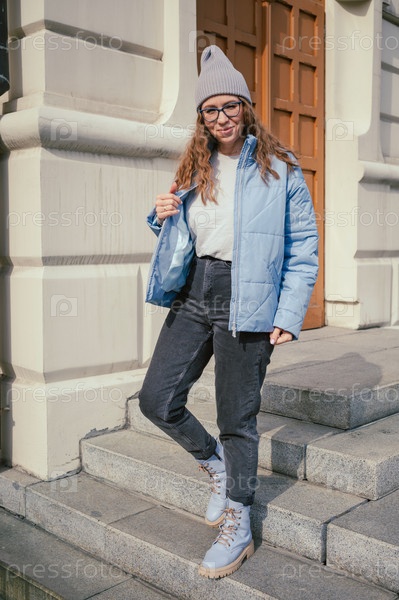 Портрет стильной женщины в синей куртке. Весенний уличный портрет