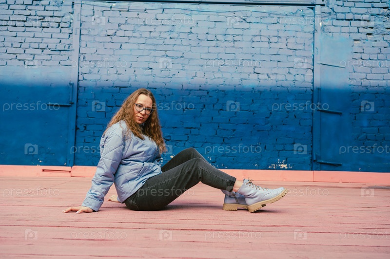 Портрет стильной женщины в синей куртке. Весенний уличный портрет