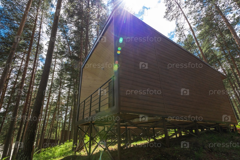 Дом или отель с панорамными окнами в сосновом лесу. Красивое летнее утро с ярким солнцем. Концепция природы или отдыха и путешествий