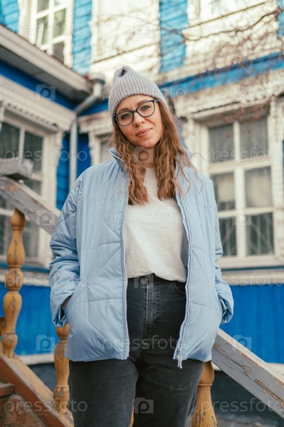 Портрет стильной женщины в синей куртке. Весенний уличный портрет