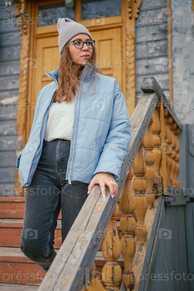 Портрет стильной женщины в синей куртке. Весенний уличный портрет