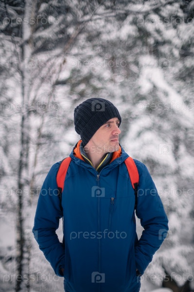Мужчина в зимней куртке гуляет по заснеженному зимнему лесу