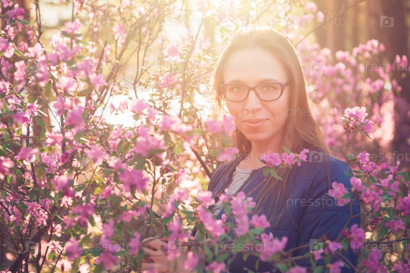 Женщина, путешествующая по горам Алтая весной, на красивом быстро развивающемся розовом фоне цветов рододендрона