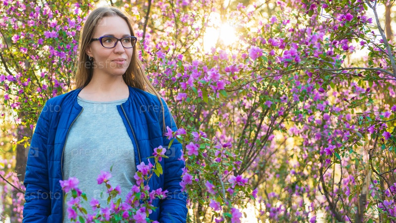 Женщина, путешествующая по горам Алтая весной, на красивом быстро развивающемся розовом фоне цветов рододендрона