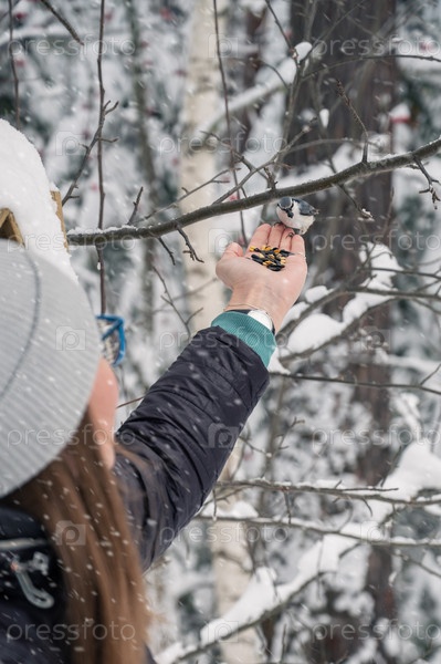 Женщина в зимней куртке кормит птиц