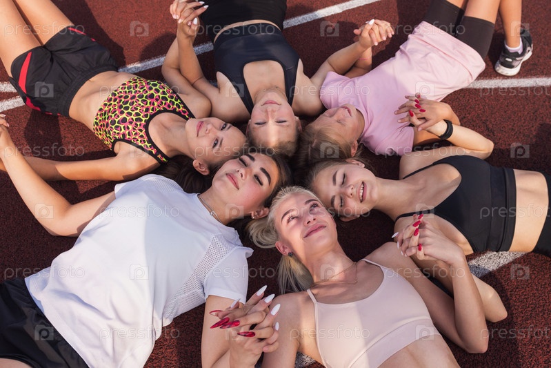 Группа девушек отдыхает на полу стадиона