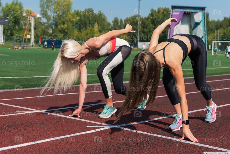 Две спортсменки, молодые женщины-бегуны на стадионе