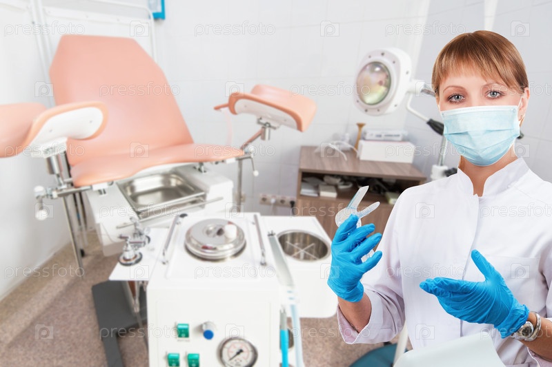 Женщина-гинеколог в защитной маске и белом халате с гинекологическим вагинальным ретрактором в руке