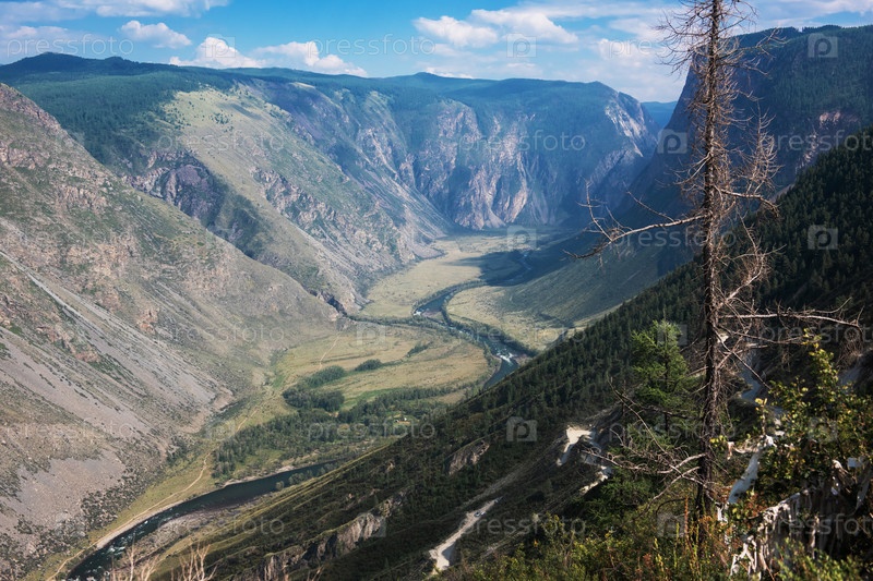 Панорама перевала Кату Ярык и долины реки Чулышман. Республика Алтай, Россия, прекрасный летний день