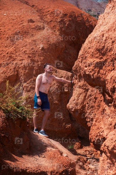 Человек-турист в песчаной карьере в Сибири и Республике Алтай