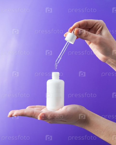 Женские руки держат пипетку с косметической сывороткой на сиреневом фоне,