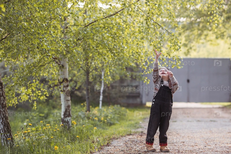 Маленький мальчик 4 лет в кепке летчика и стильной одежде играет весной на улице. Портрет ребенка на фоне березовой рощи