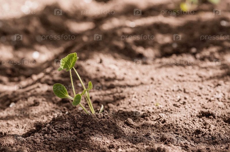 Почва с молодым растением. Посадка рассады в грунт. Рядом лежит лопата. Концепция сельского хозяйства и сбора урожая. Крупный план