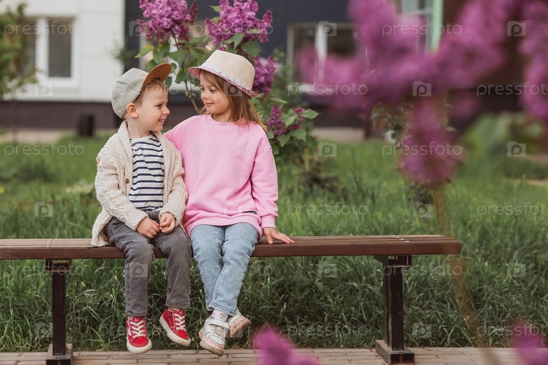 Образ жизни. Маленькие красивые дети на скамейке. Девушка и парень обнимаются и смотрят друг на друга. Концепция детской дружбы и первой любви