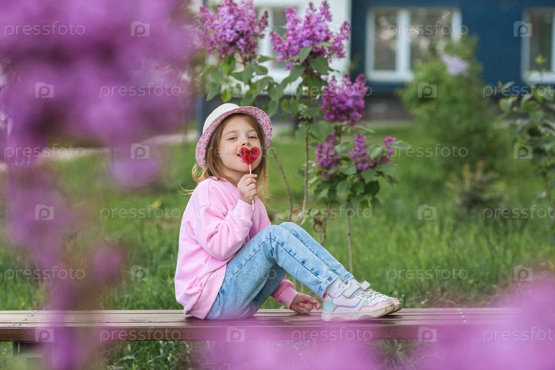 Образ жизни. Красивая маленькая девочка в розовой одежде с леденцом на палочке в форме сердца. Девушка лижет конфету. Концепция любви и сладостей