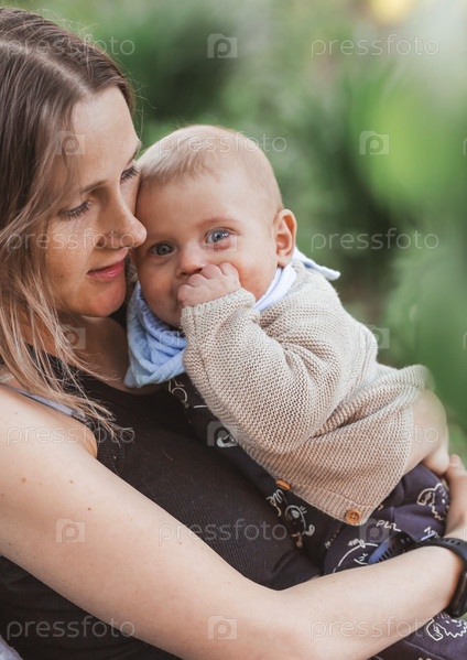 Очаровательный улыбающийся мальчик на природе на руках у матери. Ребенок 4 месяцев играет с мамой и улыбается. Семья, беременность и роды
