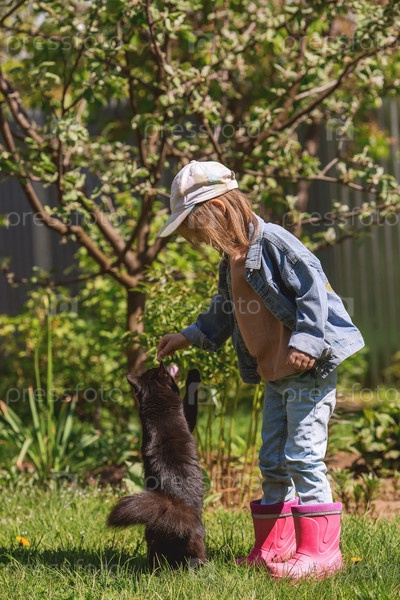 Маленькая девочка в стильной одежде играет с черной кошкой в открытом летнем саду. Концепция ухода за домашними животными. Дети и животные