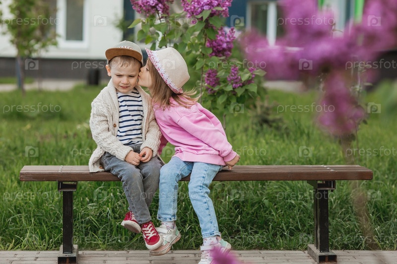 Образ жизни. Маленькие красивые дети на скамейке. Девушка целует мальчика. Концепция детской дружбы и первой любви