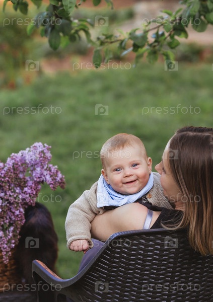 Очаровательный улыбающийся мальчик на природе на руках у матери. Ребенок 4 месяцев играет с мамой и улыбается. Семья, беременность и роды