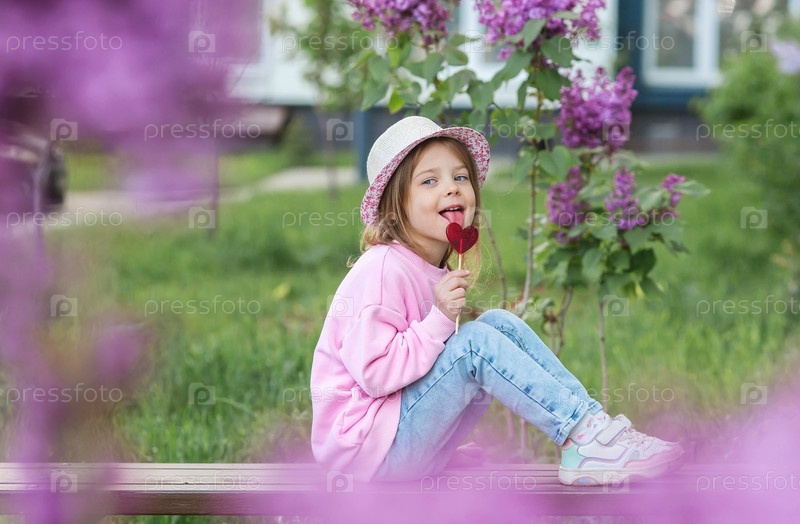 Образ жизни. Красивая маленькая девочка в розовой одежде с леденцом на палочке в форме сердца. Девушка лижет конфету. Концепция любви и сладостей