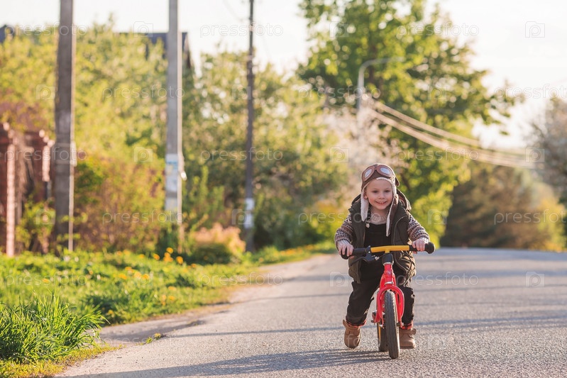 Веселый маленький мальчик катается на велосипеде на улице. Счастливый ребенок гуляет в весеннем парке. Малышка одета в модную распашонку, комбинезон. На голове пилотская шапка