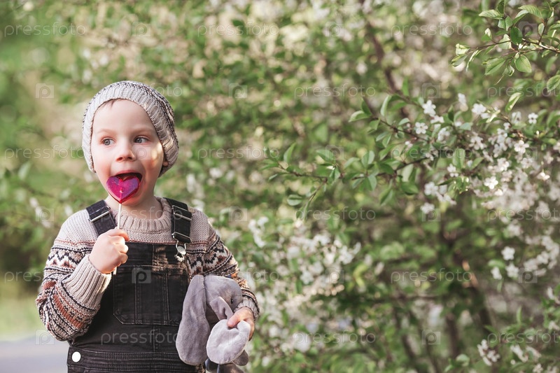 Маленький мальчик 4 лет в стильной одежде на открытом воздухе с леденцом на палочке в форме сердца. Красивый портрет улыбающегося ребенка на улице. Счастливого детства и вкусных сладостей