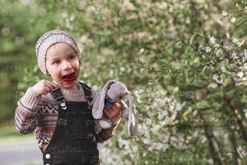 Маленький мальчик 4 лет в стильной одежде на открытом воздухе с леденцом на палочке в форме сердца. Красивый портрет улыбающегося ребенка на улице. Счастливого детства и вкусных сладостей