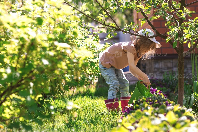 Маленькая девочка в розовых резиновых сапогах поливает цветы из лейки в летнем саду на улице. Концепция садоводства и обучения ребенка работе