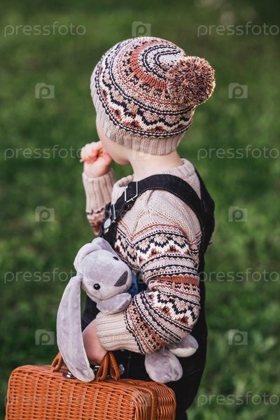 Маленький мальчик 4 лет на улице с чемоданом и плюшевым кроликом отправляется в путешествие. Красивый портрет ребенка, играющего на улице