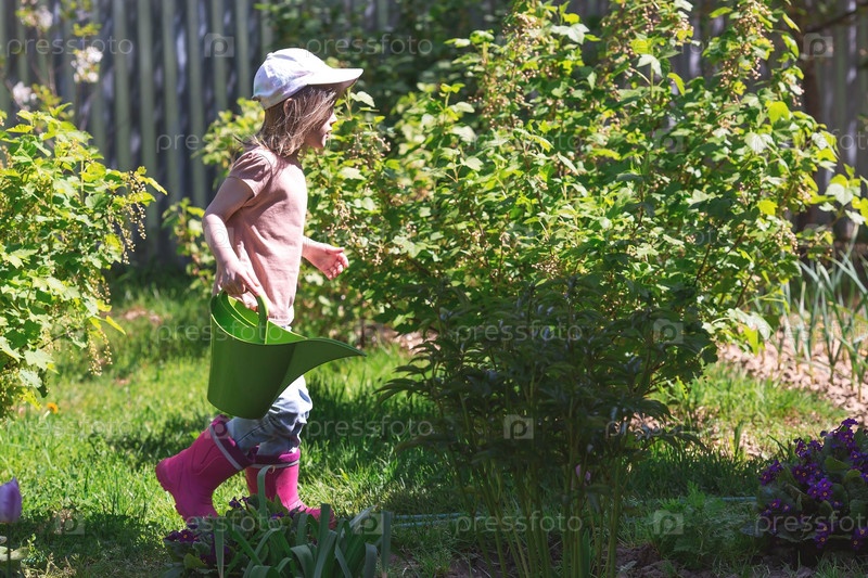 Маленькая девочка в розовых резиновых сапогах поливает цветы из лейки в летнем саду на улице. Концепция садоводства и обучения ребенка работе