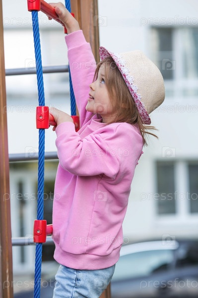 Весной на детской площадке гуляет маленькая девочка. Ребенок весело играет на открытом воздухе в солнечный весенний день. Детство и развитие ребенка