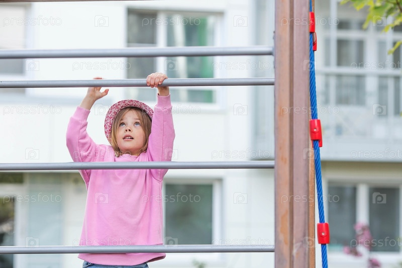 Весной на детской площадке гуляет маленькая девочка. Ребенок весело играет на открытом воздухе в солнечный весенний день. Детство и развитие ребенка