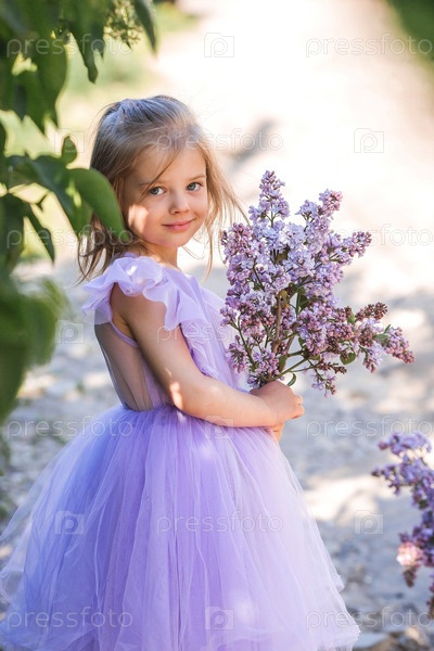 Весеннее цветение. Портрет красивой маленькой девочки 4 лет в сиреневом платье с букетом сиреневых цветов на природе. Детство. Ребенок позирует и смотрит в камеру