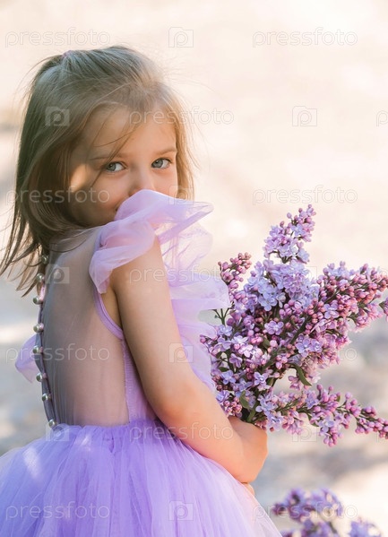 Весеннее цветение. Портрет красивой маленькой девочки 4 лет в сиреневом платье с букетом сиреневых цветов на природе. Детство. Ребенок позирует и смотрит в камеру