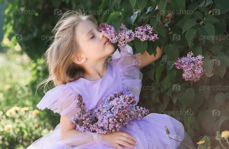 Весеннее цветение. Портрет красивой маленькой девочки 4 лет в сиреневом платье с букетом сиреневых цветов на природе. Детство. Ребенок позирует и смотрит в камеру