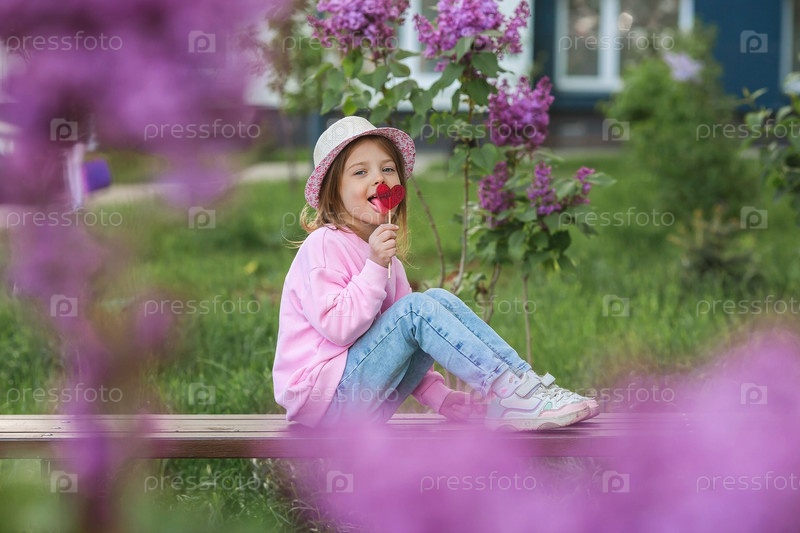 Образ жизни. Красивая маленькая девочка в розовой одежде с леденцом на палочке в форме сердца. Девушка лижет конфету. Концепция любви и сладостей