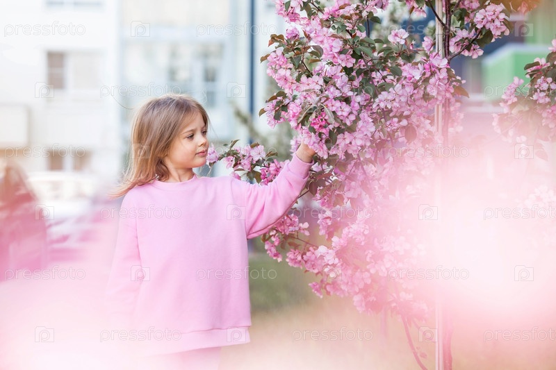 Весеннее цветение. Портрет красивой маленькой девочки 4 лет в розовой блузке на природе на фоне розовых цветущих яблонь. Детство. Малышка позирует