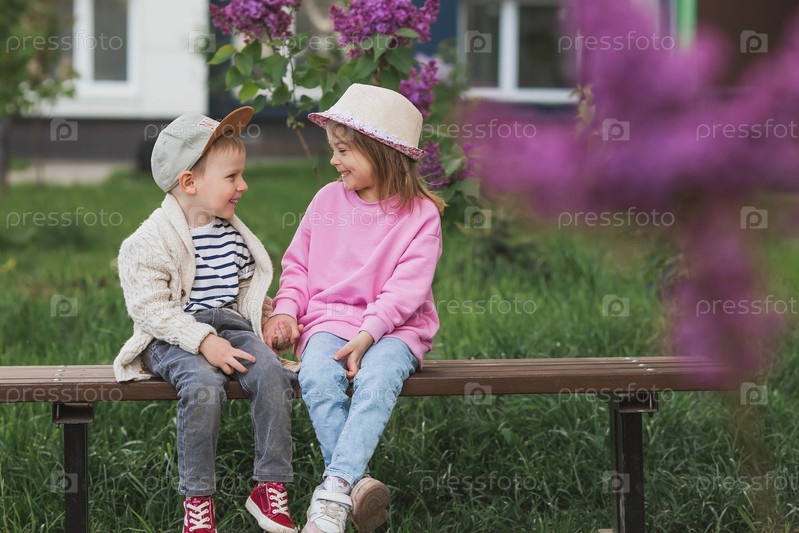 Образ жизни. Маленькие красивые дети на скамейке. Девушка и парень обнимаются и смотрят друг на друга. Концепция детской дружбы и первой любви