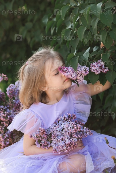 Весеннее цветение. Портрет красивой маленькой девочки 4 лет в сиреневом платье с букетом сиреневых цветов на природе. Детство. Ребенок позирует и смотрит в камеру