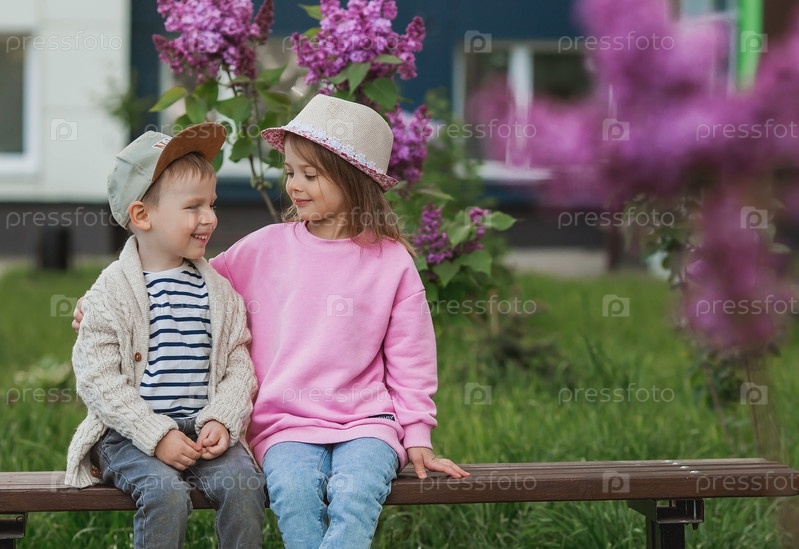 Образ жизни. Маленькие красивые дети на скамейке. Девушка и парень обнимаются и смотрят друг на друга. Концепция детской дружбы и первой любви