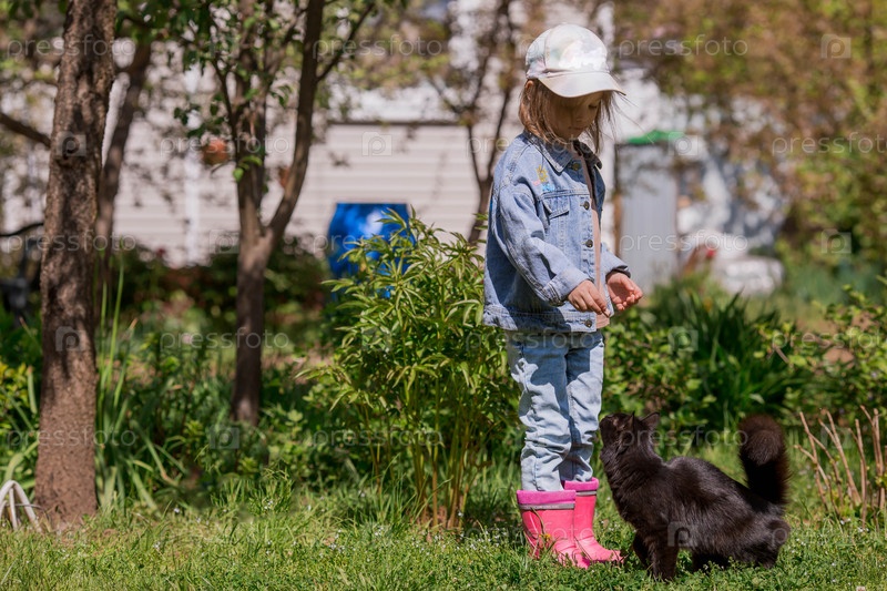 Маленькая девочка в стильной одежде играет с черной кошкой в открытом летнем саду. Концепция ухода за домашними животными. Дети и животные