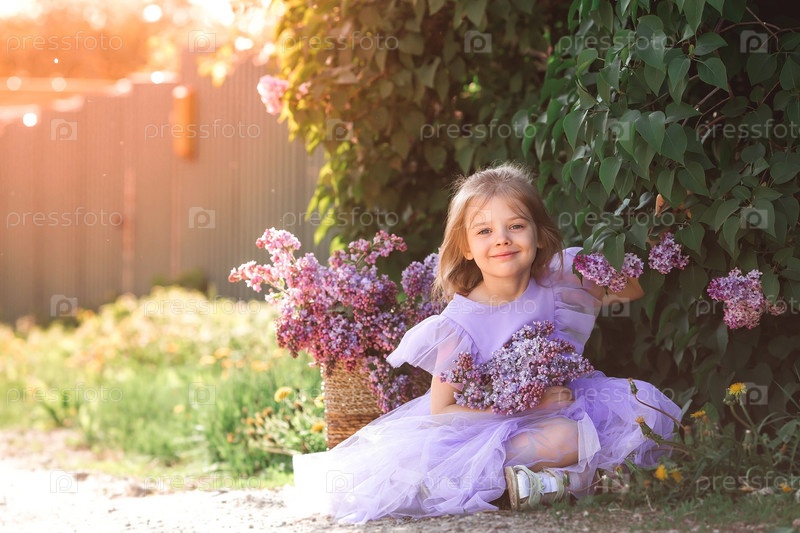 Весеннее цветение. Портрет красивой маленькой девочки 4 лет в сиреневом платье с букетом сиреневых цветов на природе. Детство. Ребенок позирует и смотрит в камеру