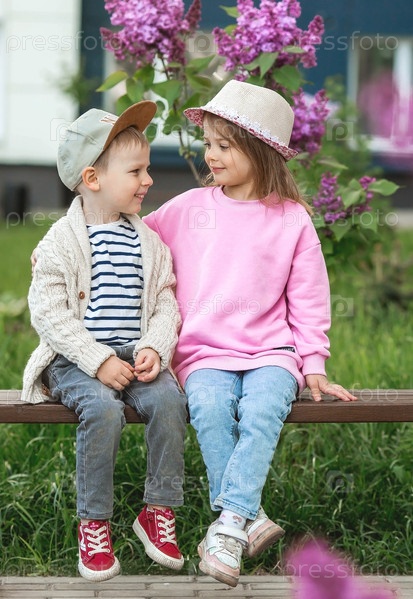 Образ жизни. Маленькие красивые дети на скамейке. Девушка и парень обнимаются и смотрят друг на друга. Концепция детской дружбы и первой любви