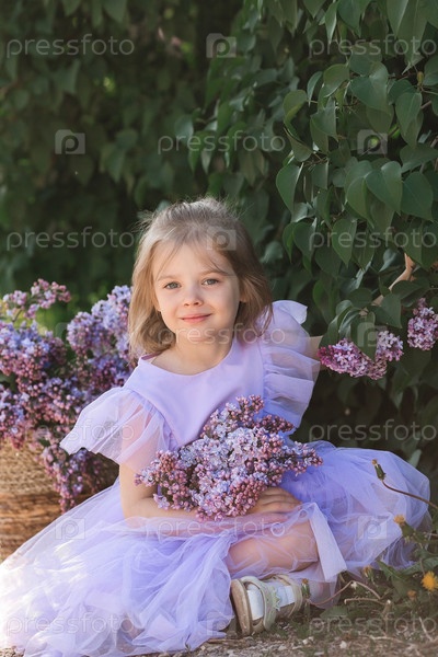 Весеннее цветение. Портрет красивой маленькой девочки 4 лет в сиреневом платье с букетом сиреневых цветов на природе. Детство. Ребенок позирует и смотрит в камеру