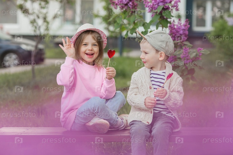 Образ жизни. Маленькие красивые дети играют на скамейке с леденцами на палочке в форме сердца. Концепция детской дружбы и первой любви